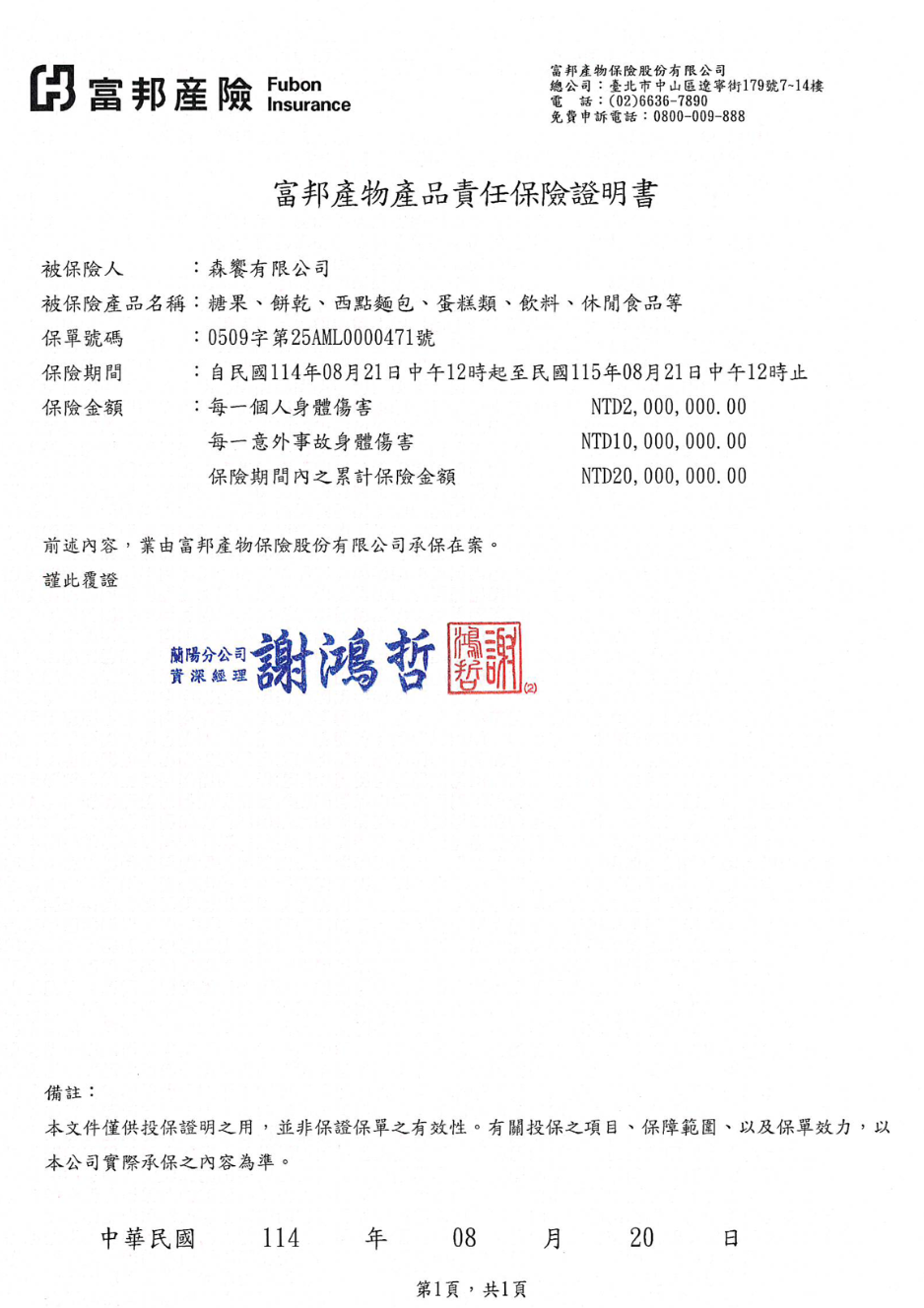 - 保險內容:本保險係保障因產品所致消費者損害之法徑賠償責任,詳細保障內容、期間與不保事項悉以保單條款為準